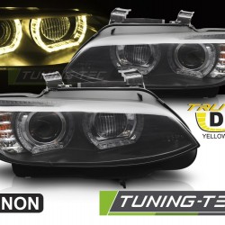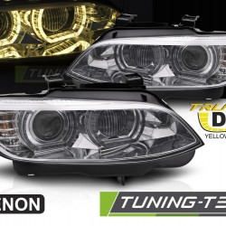 PL EN Opis Description Lampy soczewkowe xenonowe z ringami 3D Angel Eyes.Z ???tym ?wiat?em pozycyjnym oraz ?wiat?em do jazdy dziennej.Tylko wersje bez funkcji AFS.100% nowe, w komplecie (lewa i prawa).Homologacja: norma E6 - dopuszczone do ruchu, zgodne z ECE-R87. Xenon Faruri cu Angel Eyes 3D dubl..